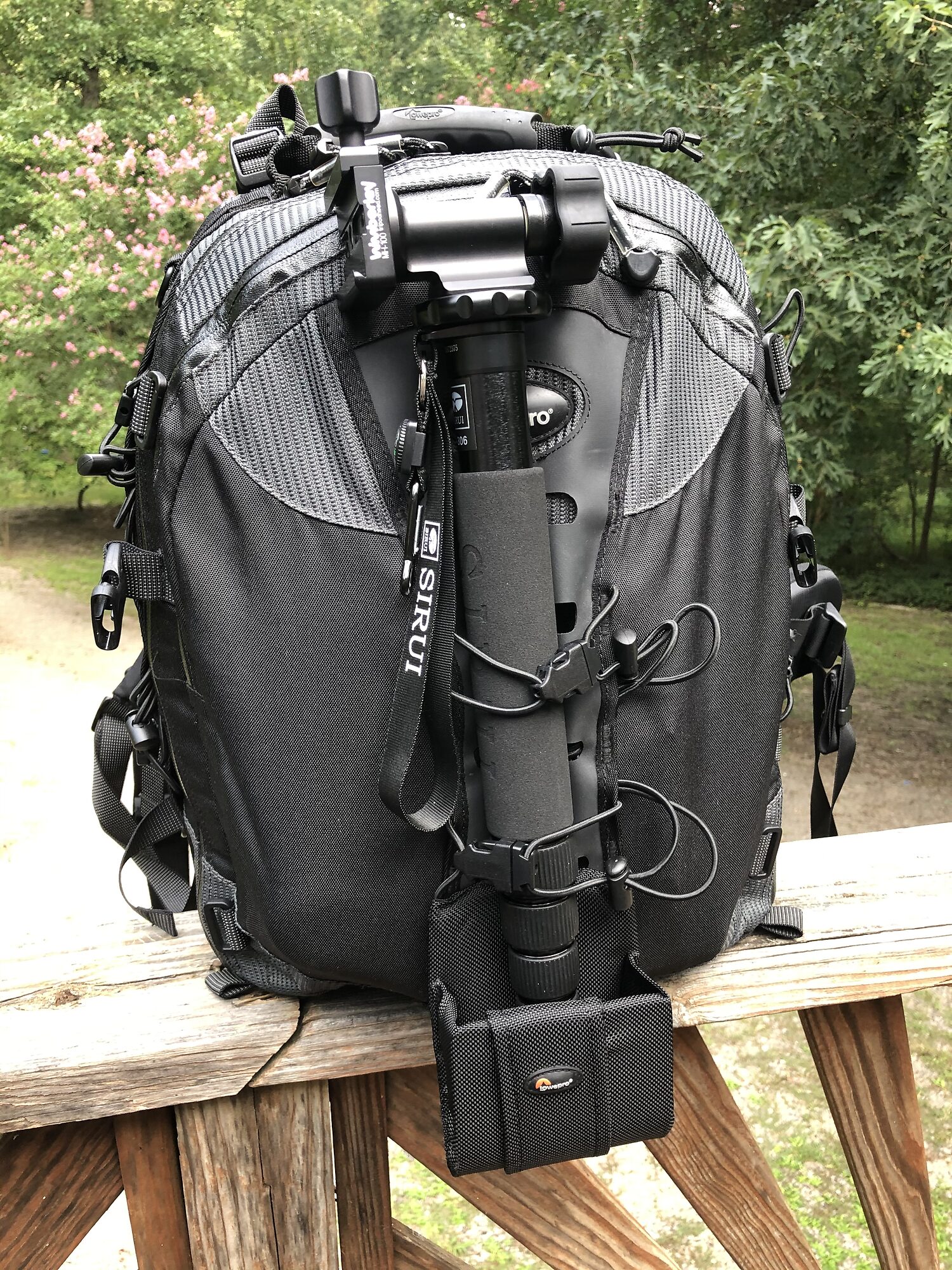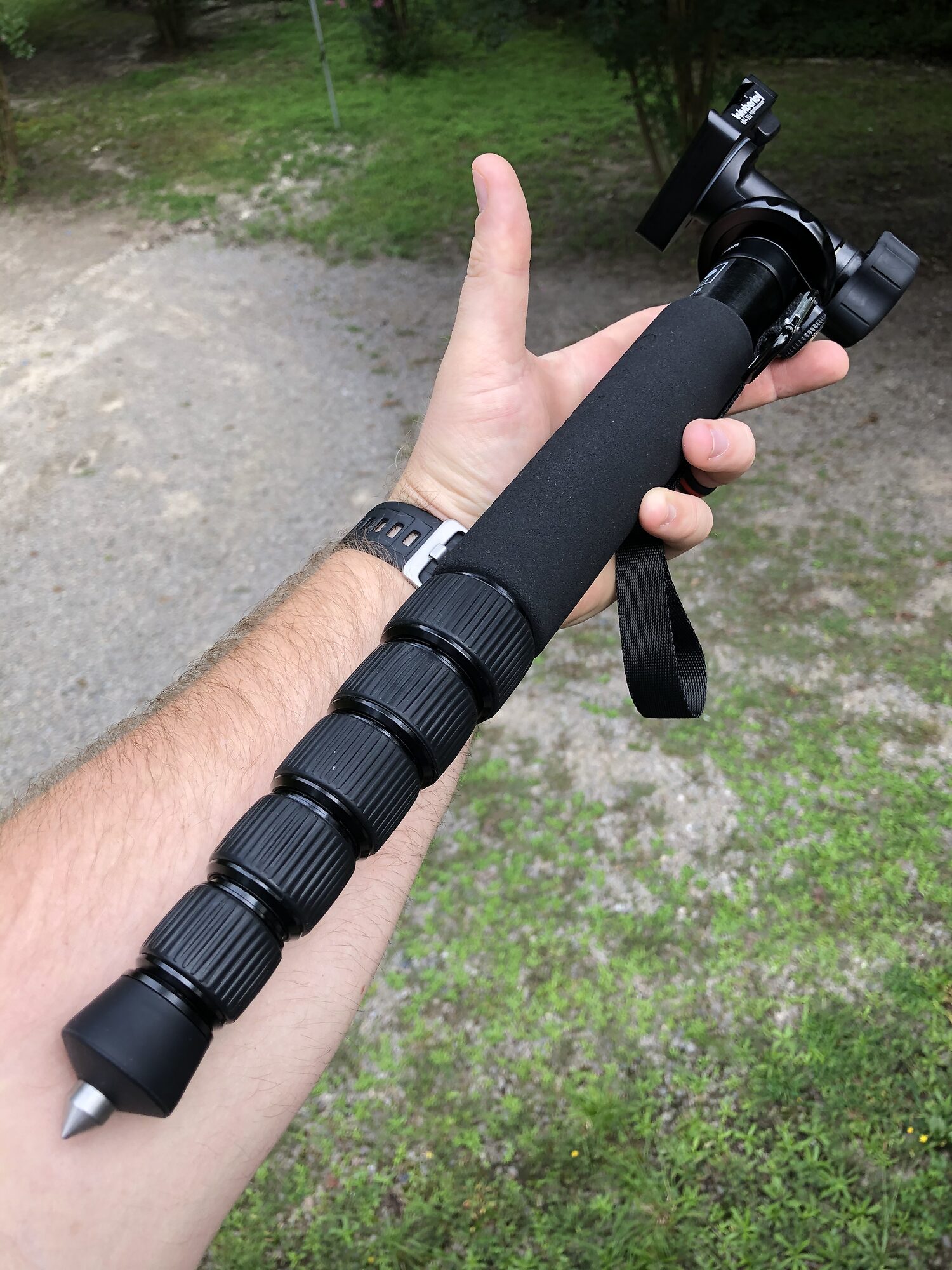 I also find the Wimberly MH100 to be money well spent. I turn the collar the other way, on the left. Then when hiking I tuck the monopod up under my left arm, camera strap around my neck. Hopefully the trail isn't too twisty or have too much brush around it. I put a cage on my camera, attached a plate to it, then can use the mh100 with small lenses as well. The smoothness and strength are outstanding. No creep whatsoever.