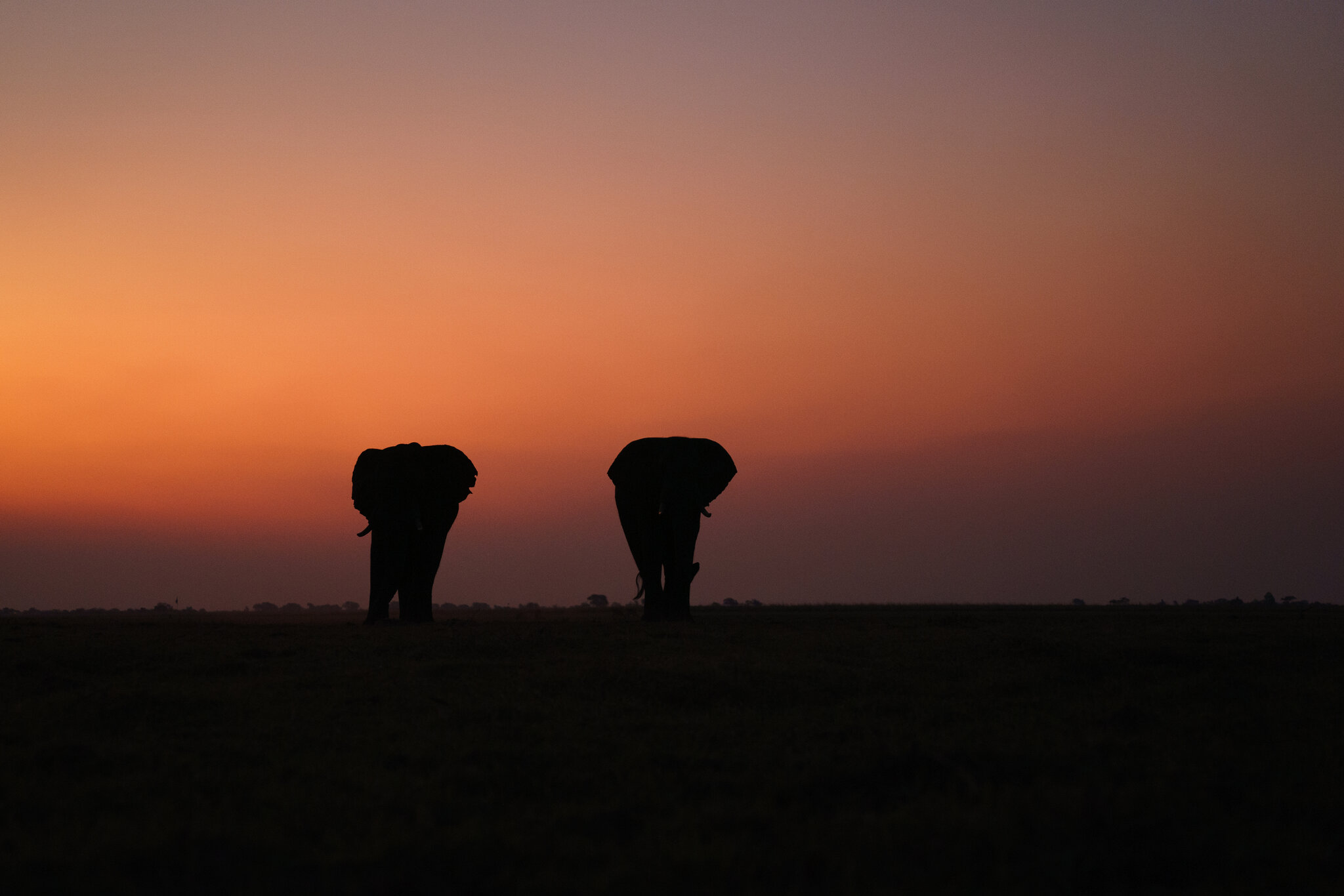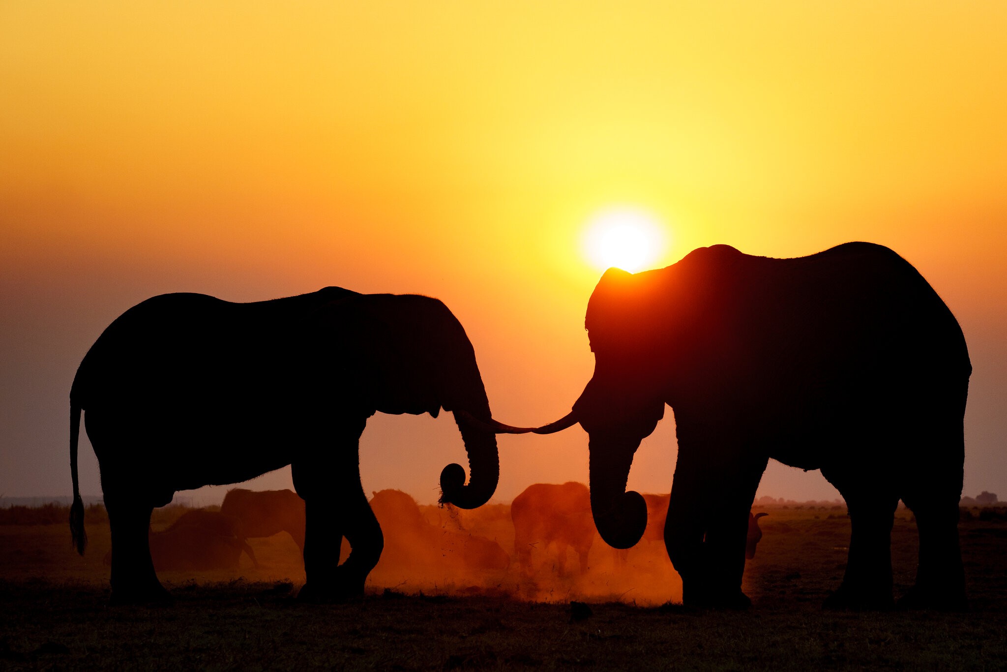 In Botswana last year, near the end of their dry season, we had the most spectacular sunsets, largely due to dust in the air as well as smoke from the large number of veld fires they had at that time. These two bull elephants were enjoying the sunset with us.